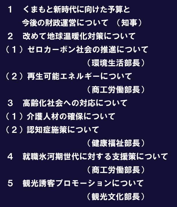 【質問(岩下)】JRグループ6社と県、市町村、地元の観光事業者などが協力し、全国規模で集中的に観光宣伝販売活動を行う熊本デスティネーションキャンペーンの実施が発表された。前回は、熊本地震からの復興を掲げて令和元年に行われ、一定の効果があったと聞いているが、JR沿線以外の地域では十分なメリットがなかったのではないか、また、キャンペーン期間中だけの効果にとどまるのではないかとの懸念もある。一過性のイベントに終わることなく、持続的に観光客を呼び込むことができるものであってほしいが、県としてどのように取り組むのか、観光文化部長にたずねる。
